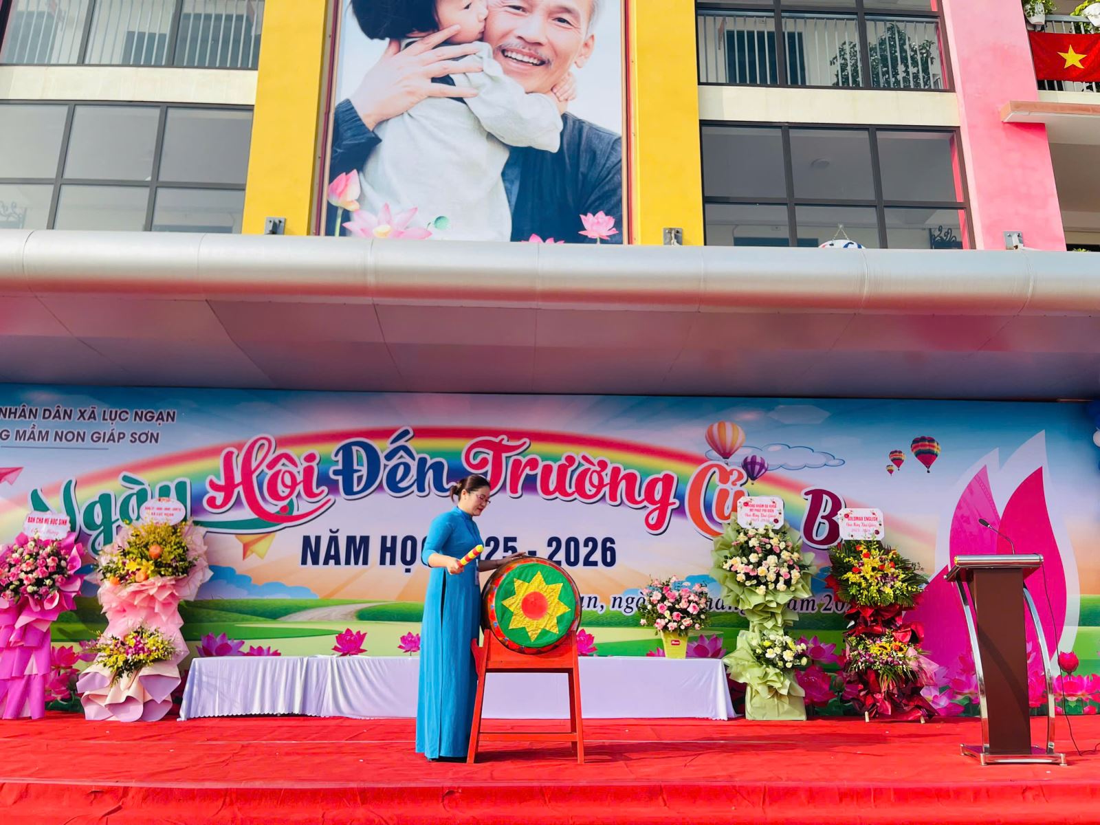Hình ảnh ĐC: Dương Thị Nghĩa - Bí thư CB - Hiệu trưởng nhà trường lên đánh trống khai trường