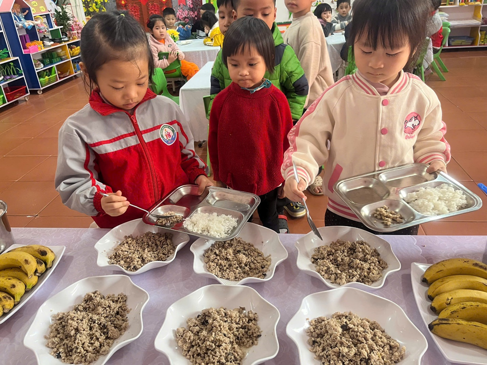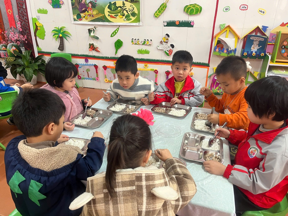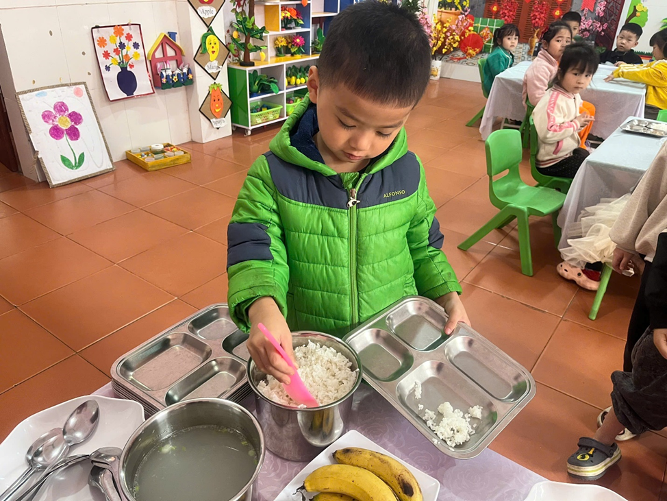 Nhu cầu dinh dưỡng của mỗi trẻ là không giống nhau phụ thuộc vào giới tính, sức khỏe, khả năng hấp thụ. Một chế độ dinh dưỡng phù hợp sẽ tạo điều kiện tốt để trẻ phát triển vóc dáng, thể lực và trí tuệ. Cơ thể trẻ lứa tuổi mầm non đang trong giai đoạn phát triển rất nhanh, đòi hỏi khẩu phần ăn phải đầy đủ cả về chất lượng và số lượng. Tại trường mầm non Việt Ngọc, trẻ mẫu giáo được ăn hai bữa/ngày bao gồm 1 bữa chính trưa và một bữa phụ chiều trong đó bữa chính trưa là quan trọng nhất. Thông qua bữa ăn trưa, trẻ được bù đắp những năng lượng đã bị tiêu hao và cung cấp năng lượng mới để tham gia vào các hoạt động tiếp theo. Vì vậy việc tổ chứa bữa ăn cho trẻ ở trường mầm non là một trong những nhiệm vụ quan trọng trong quá trình chăm sóc - nuôi dưỡng - giáo dục trẻ.