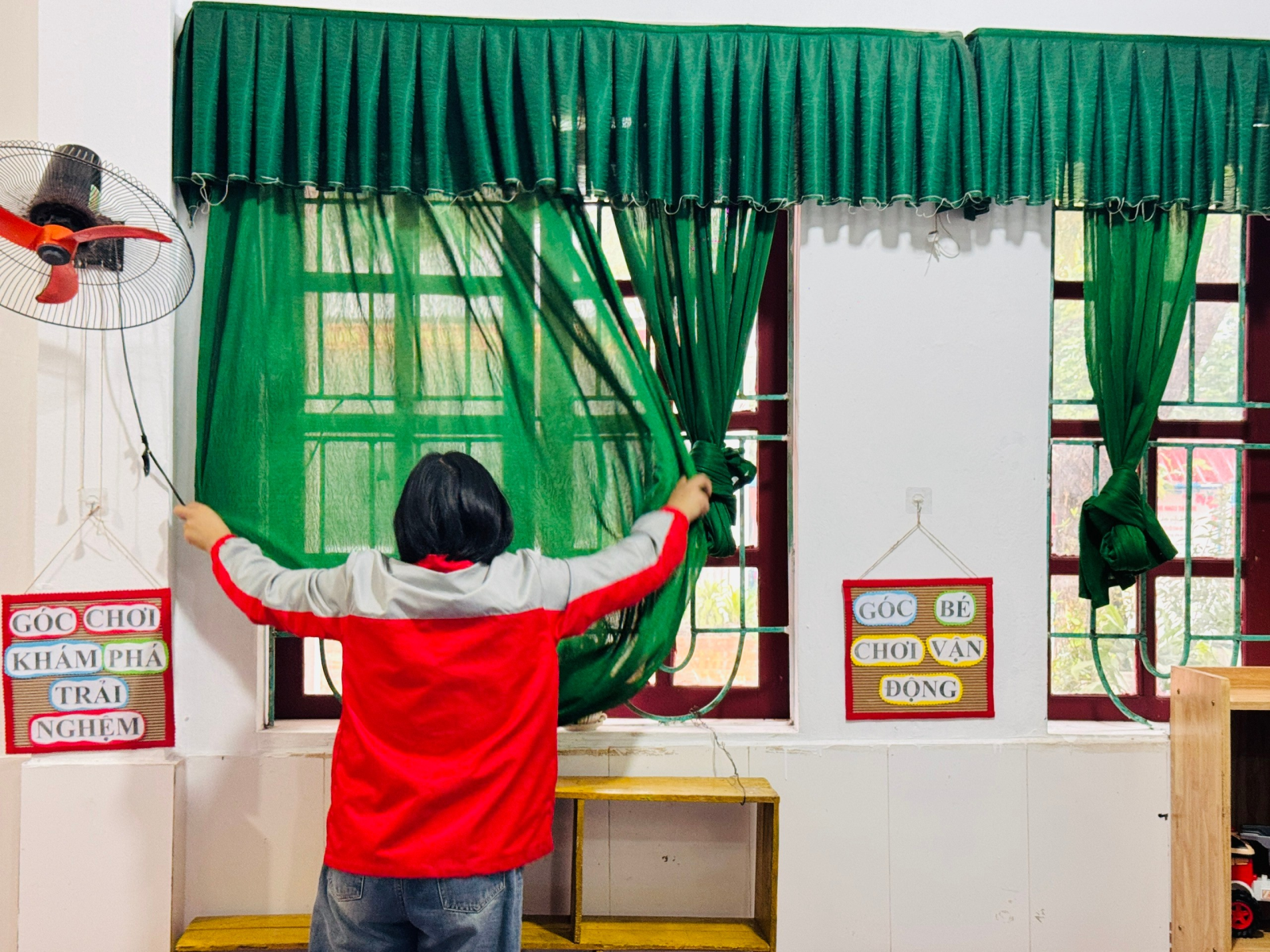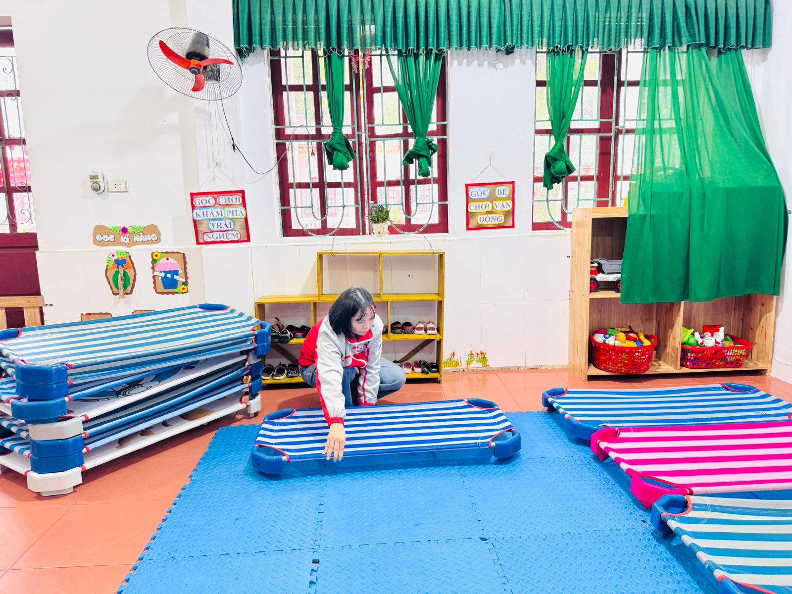 Không gian lớp học trước giờ ngủ trưa, trẻ được cô giáo hướng dẫn chuẩn bị chỗ ngủ