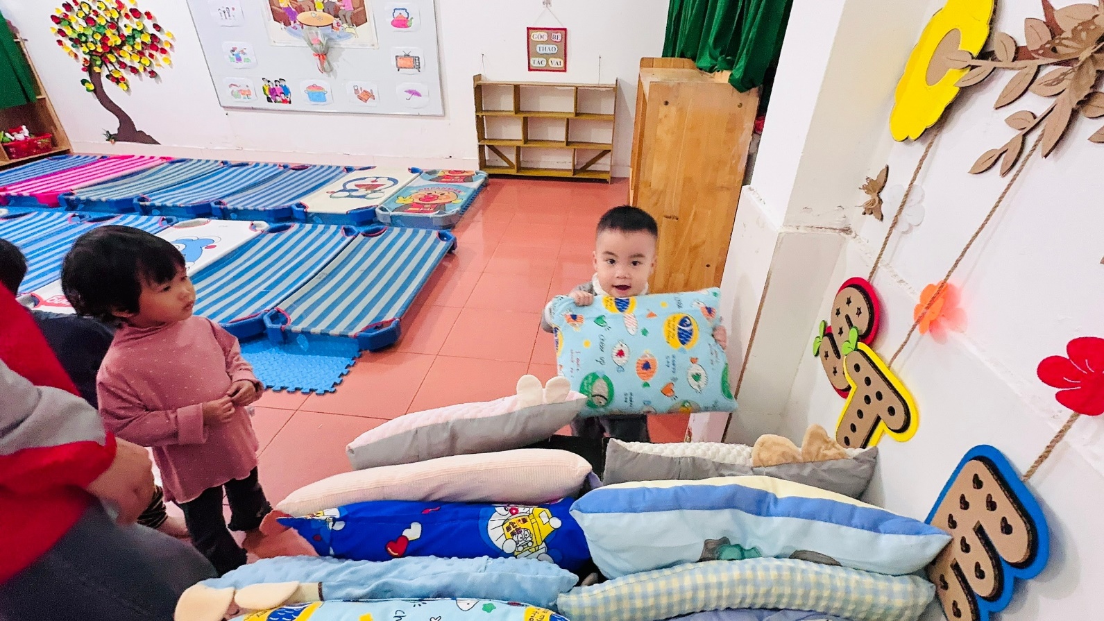 Trẻ tự giác lấy gối, chăn và xếp gọn gàng trước khi ngủ
