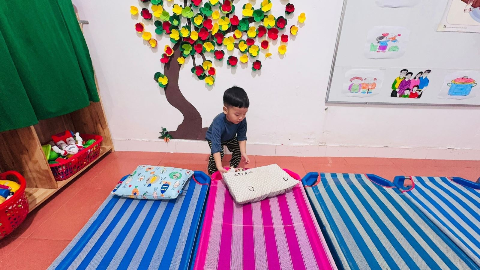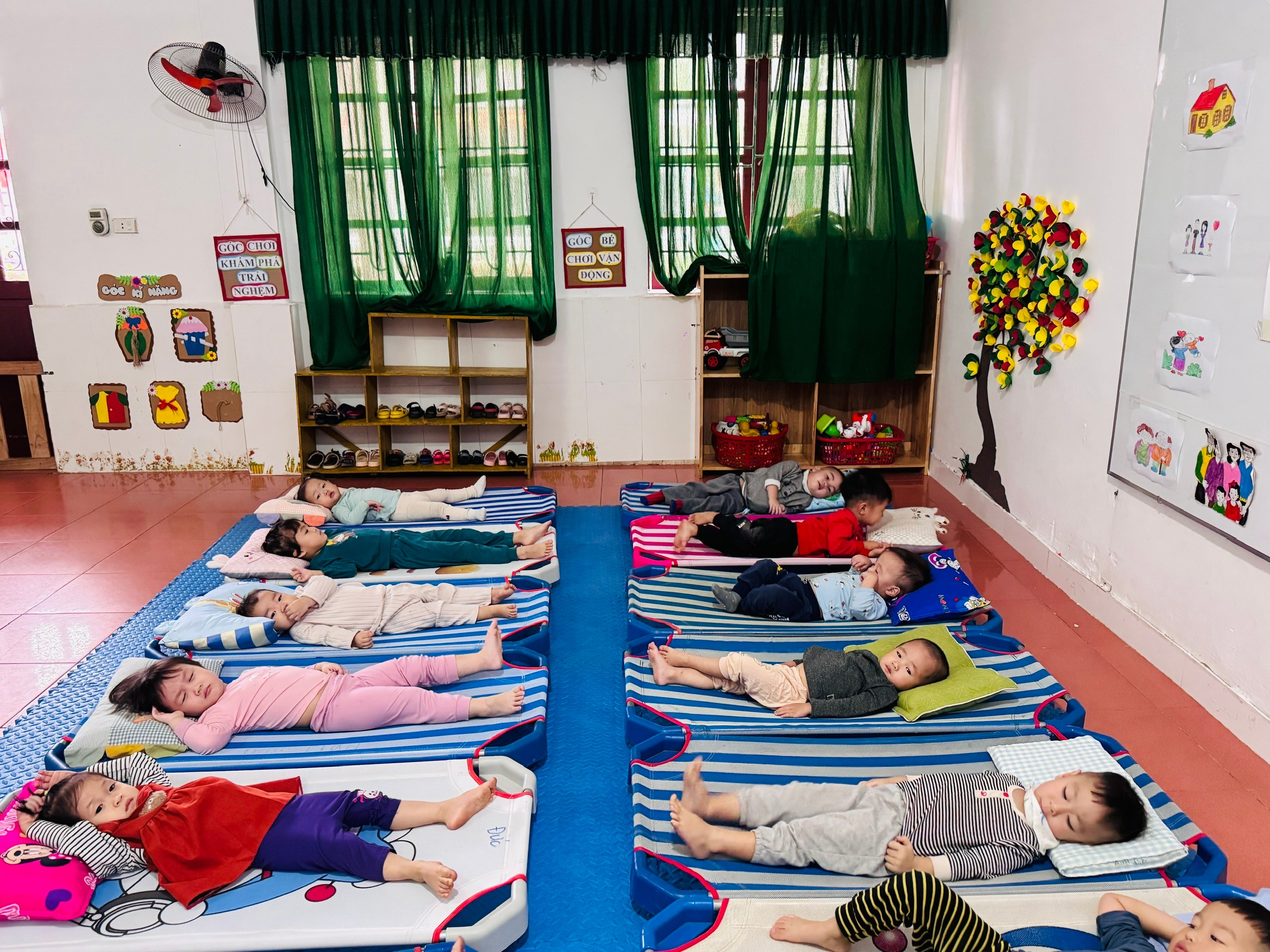 Trẻ nằm ngủ ngay ngắn, lớp học yên tĩnh, ánh sáng dịu nhẹ
