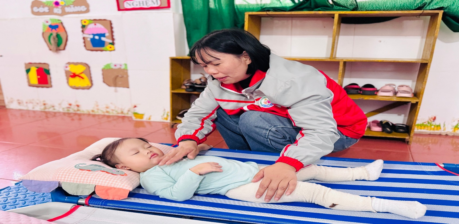 Cô giáo nhẹ nhàng chăm sóc, đắp chăn cho trẻ trong giờ ngủ